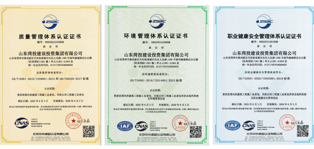 为提升企业综合管理能力,2025年初,菏投建设启动工程建设施工企业QJES管理体系认证工作。5月23日-28日,外部审核专家组一行3人,对菏投建设体系认证所覆盖的质量、环境、职业健康安全管理体系运行情况进行了全面审核。审核组一致认为,体系运行符合认证标准要求,菏投建设顺利通过现场审核并获得相关管理体系认证证书。