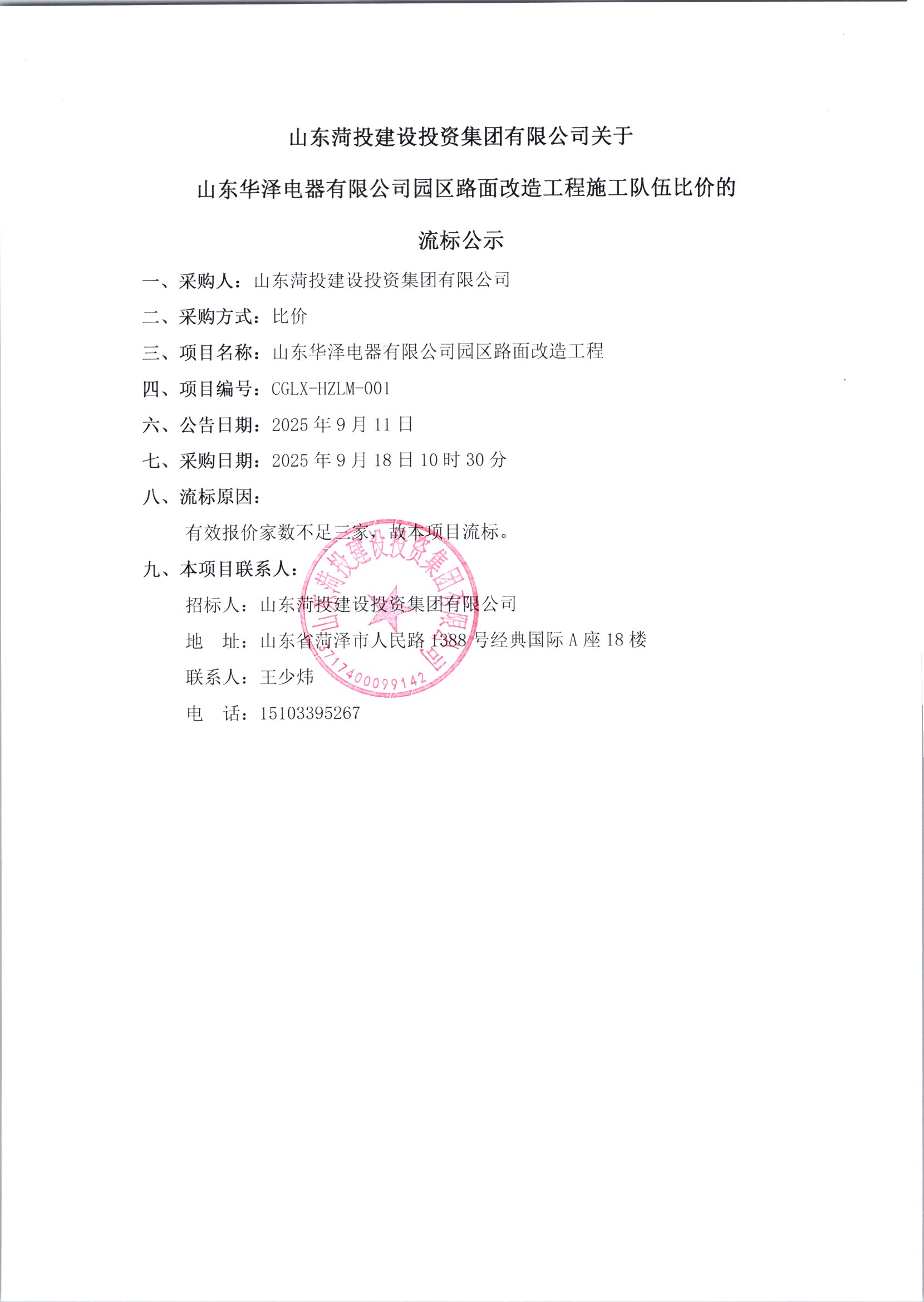 山东菏投建设投资集团有限公司关于山东华泽电器有限公司园区路面改造工程施工队伍比价的流标公示