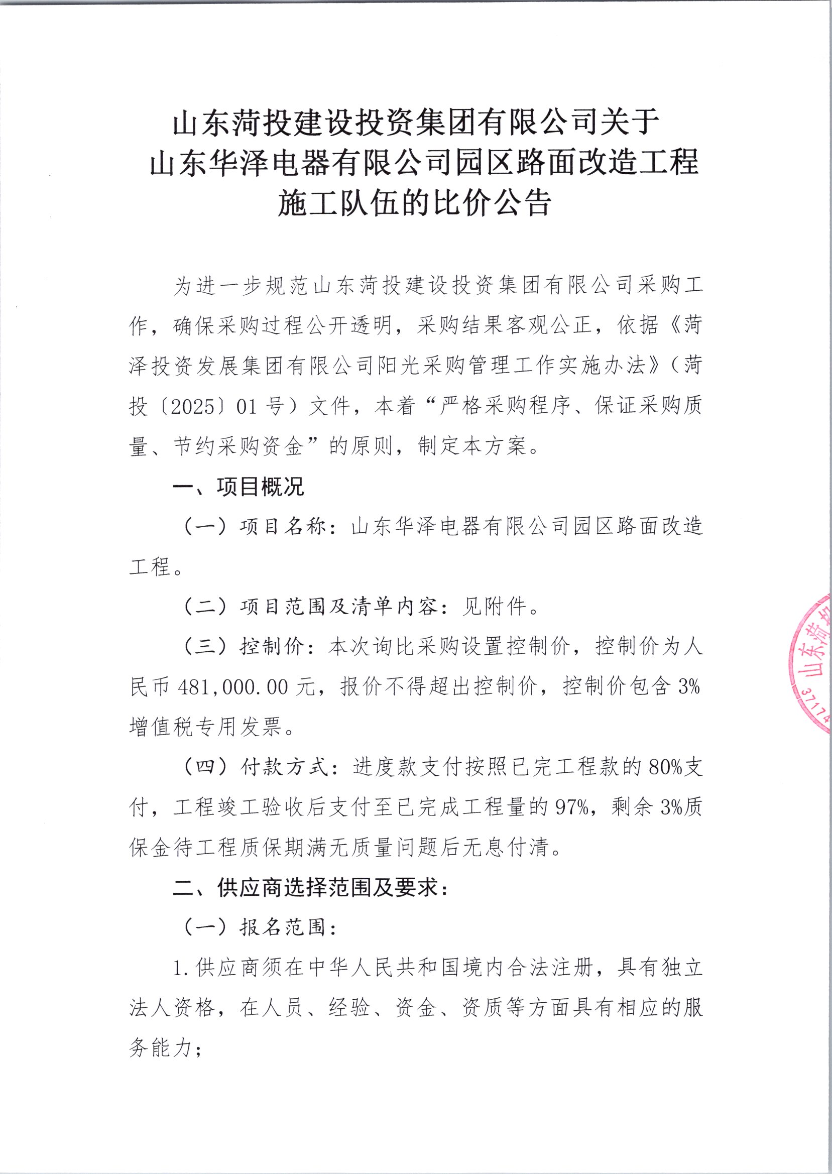 山东菏投建设投资集团有限公司关于山东华泽电器有限公司园区路面改造工程施工队伍的比价公告