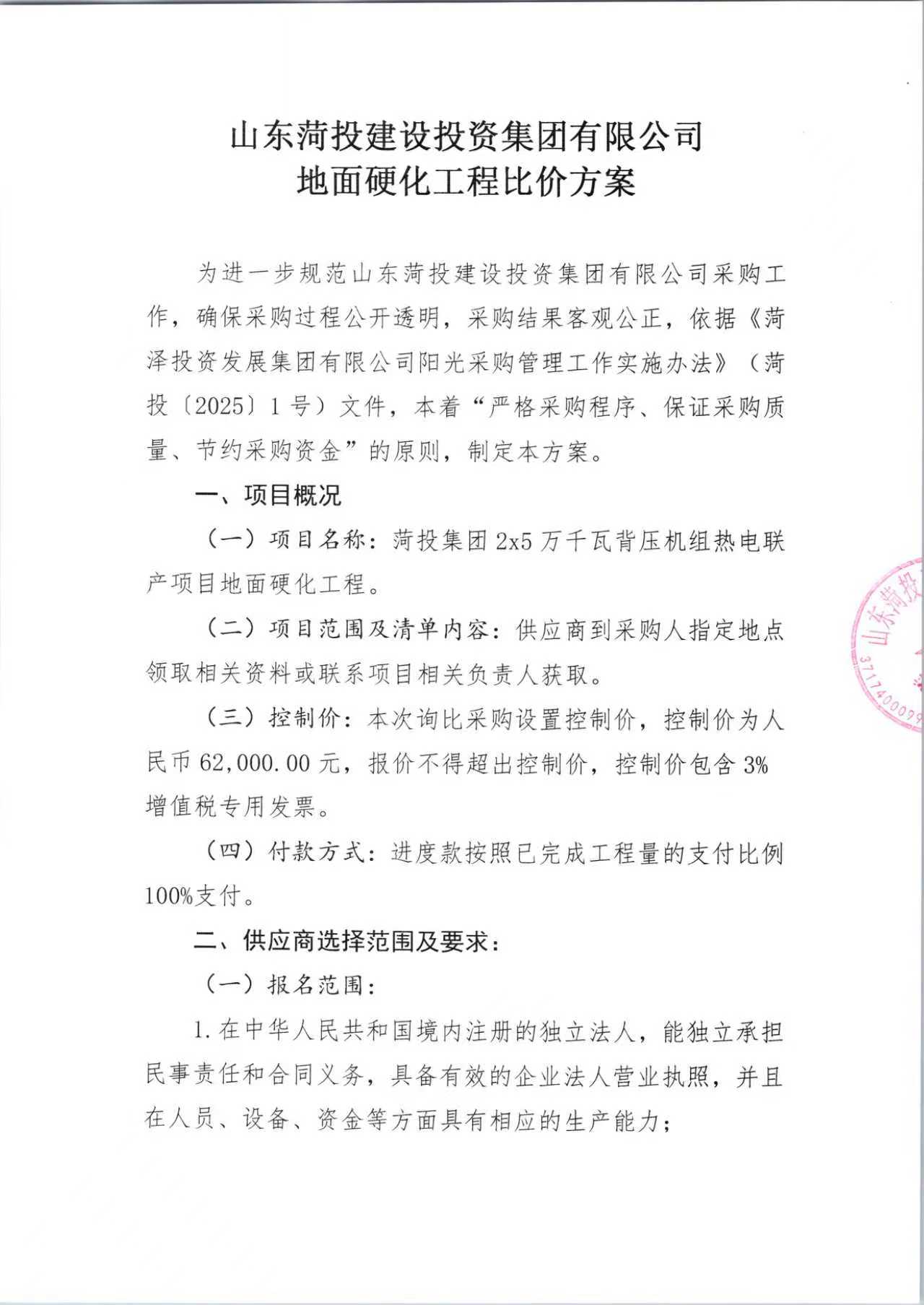 山东菏投建设投资集团有限公司地面硬化工程比价方案