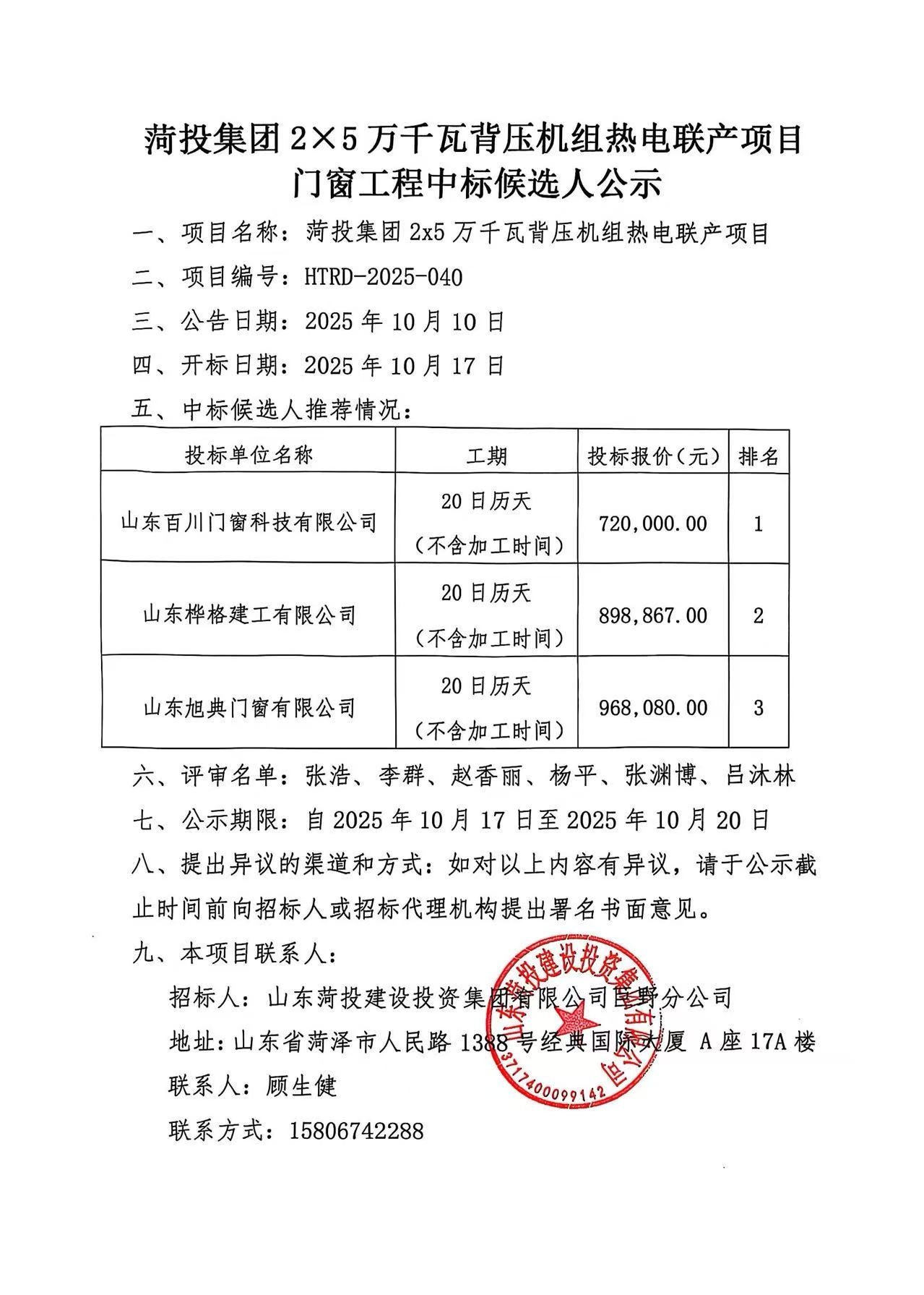 菏投集团2×5万千瓦背压机组热电联产项目门窗工程中标候选人公示