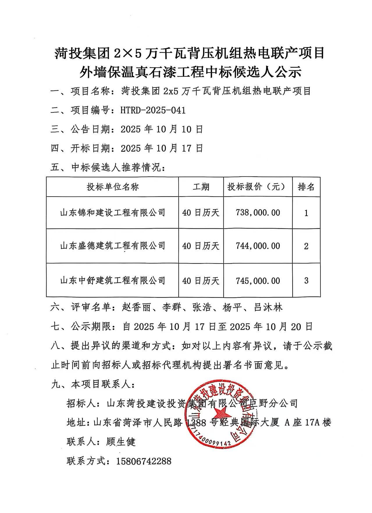 菏投集团2×5万千瓦背压机组热电联产项目外墙保温真石漆工程中标候选人公示