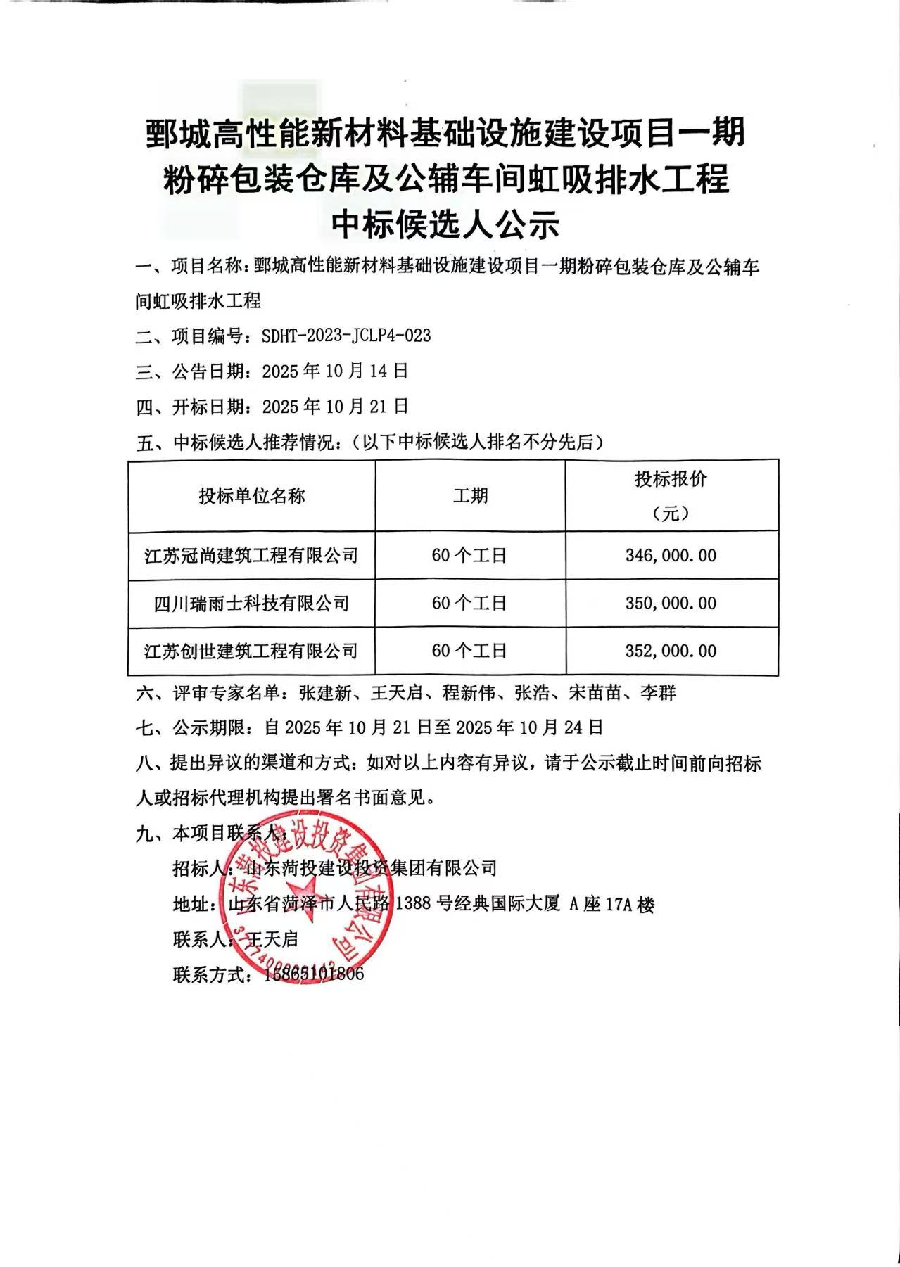 鄄城高性能新材料基础设施建设项目一期粉碎包装仓库及公辅车间虹吸排水工程 中标候选人公示
