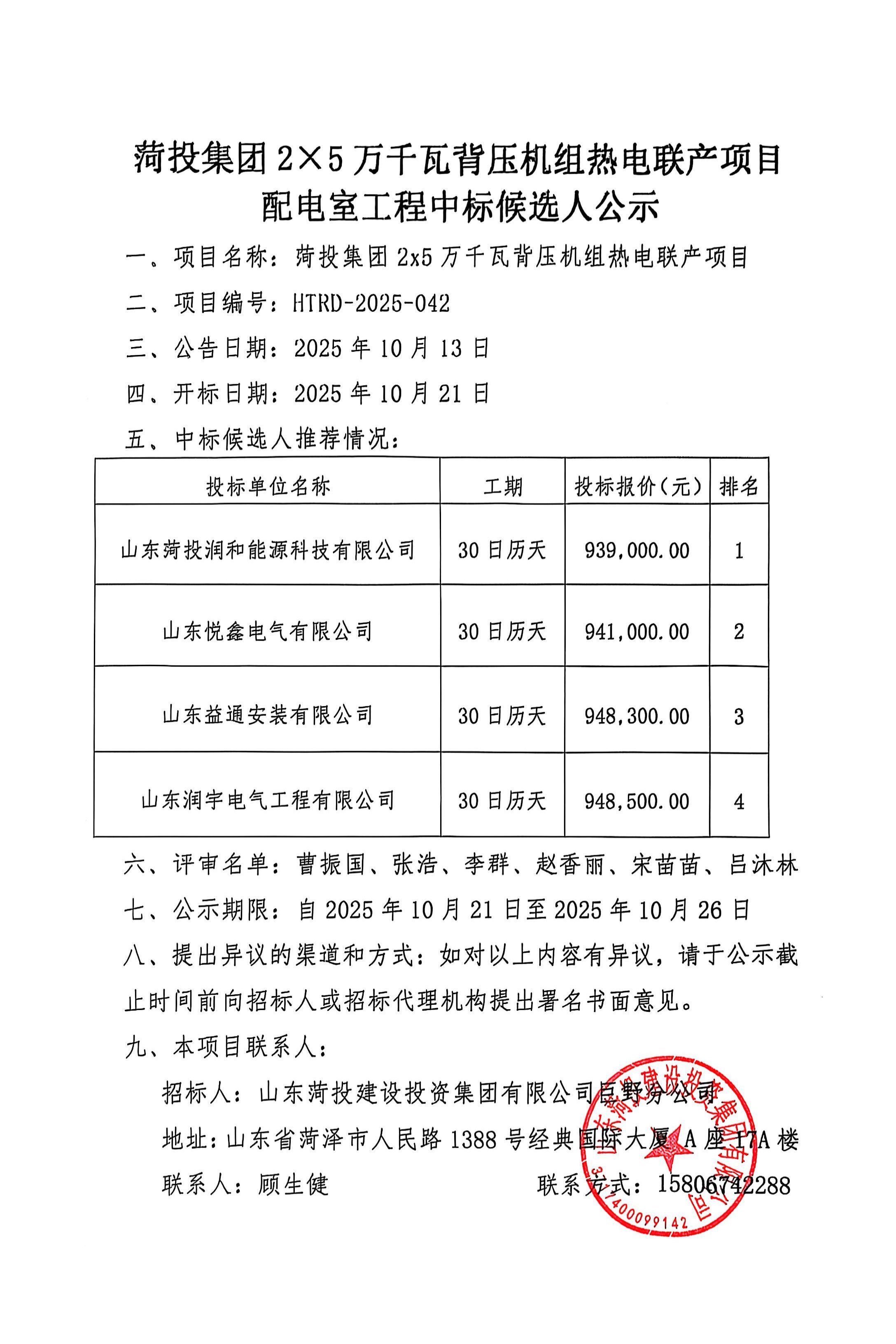 菏投集团2X5万千瓦背压机组热电联产项目 配电室工程中标候选人公示