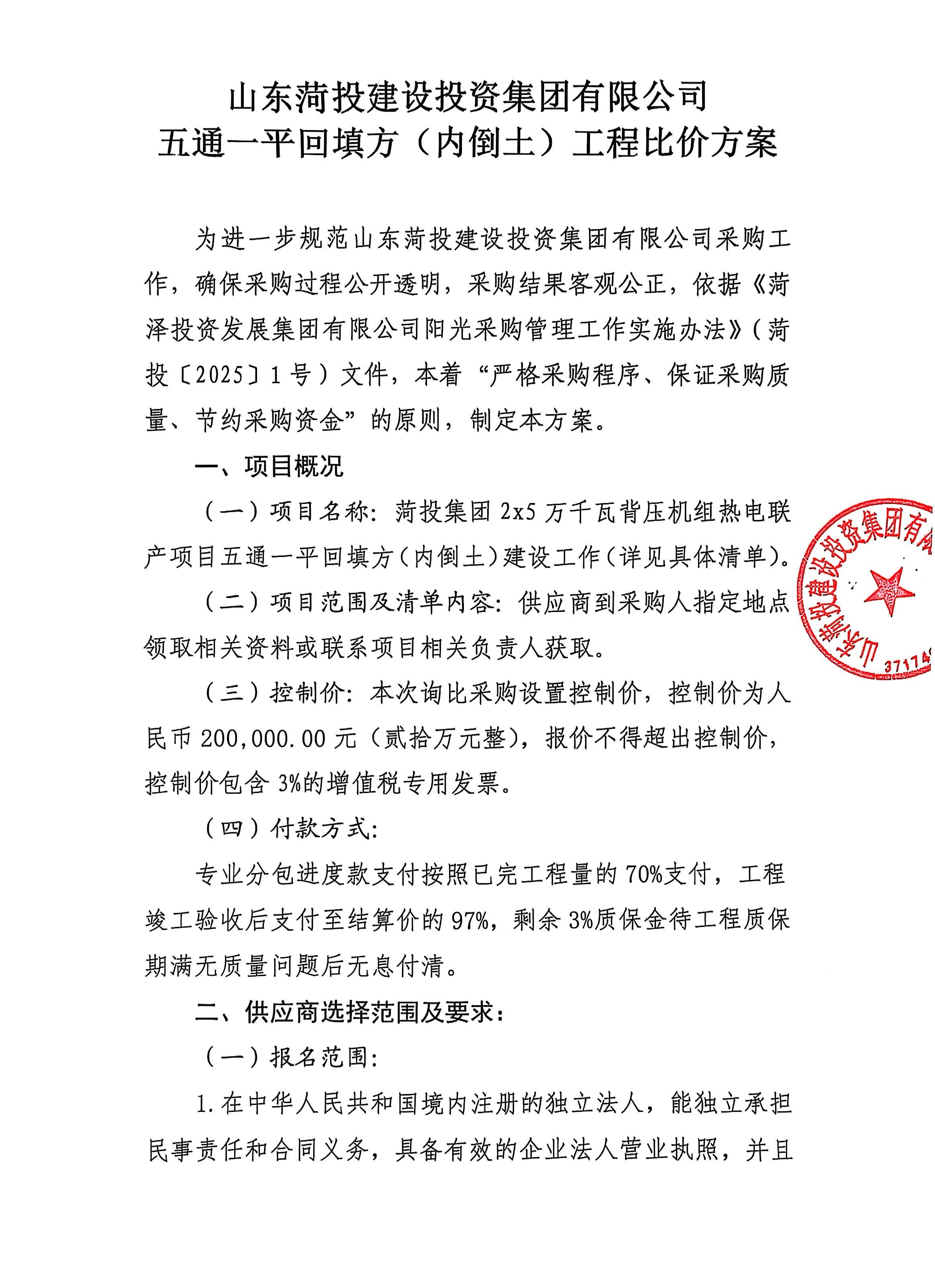 山东菏投建设投资集团有限公司 五通一平回填方(内倒土)工程比价方案