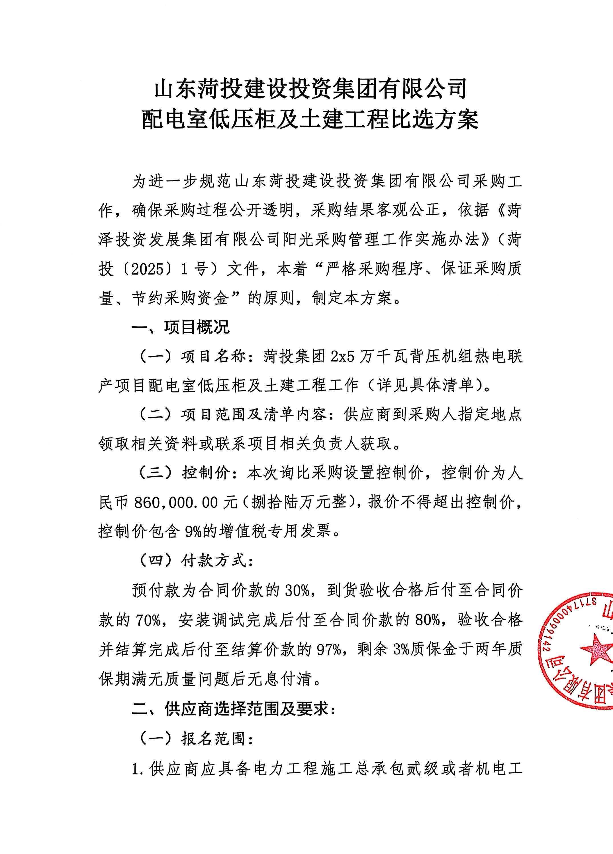 山东菏投建设投资集团有限公司配电室低压柜及土建工程比选方案