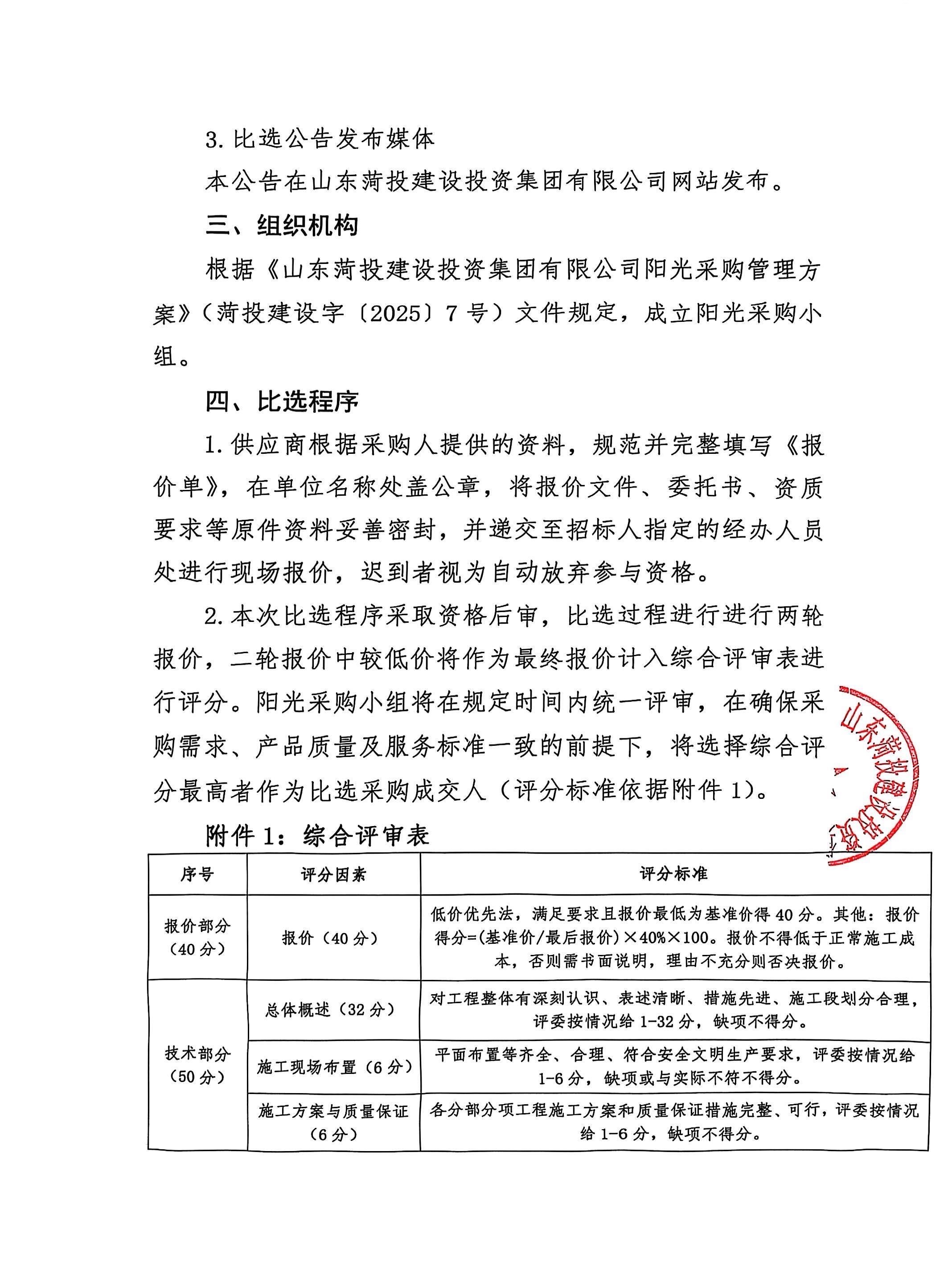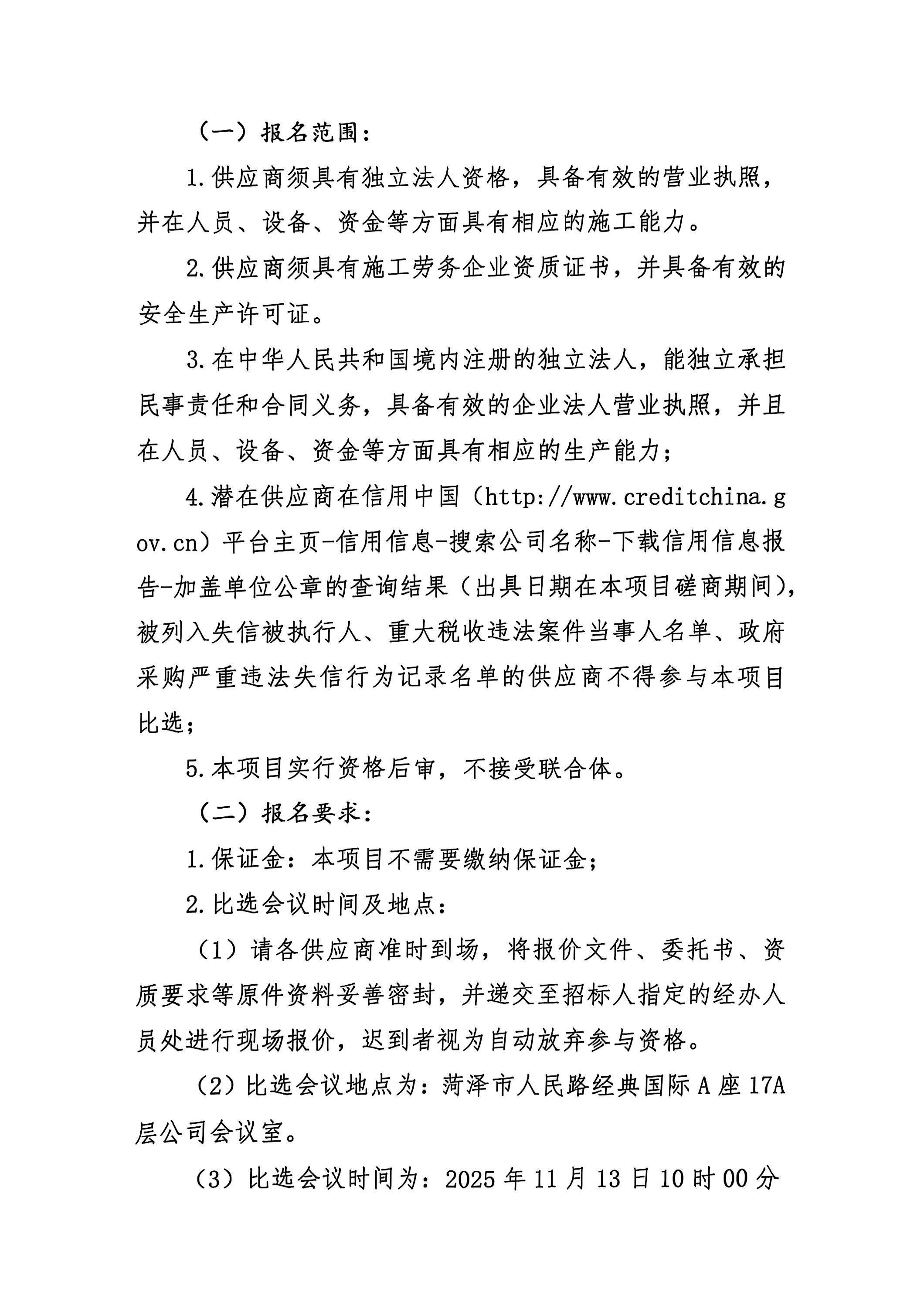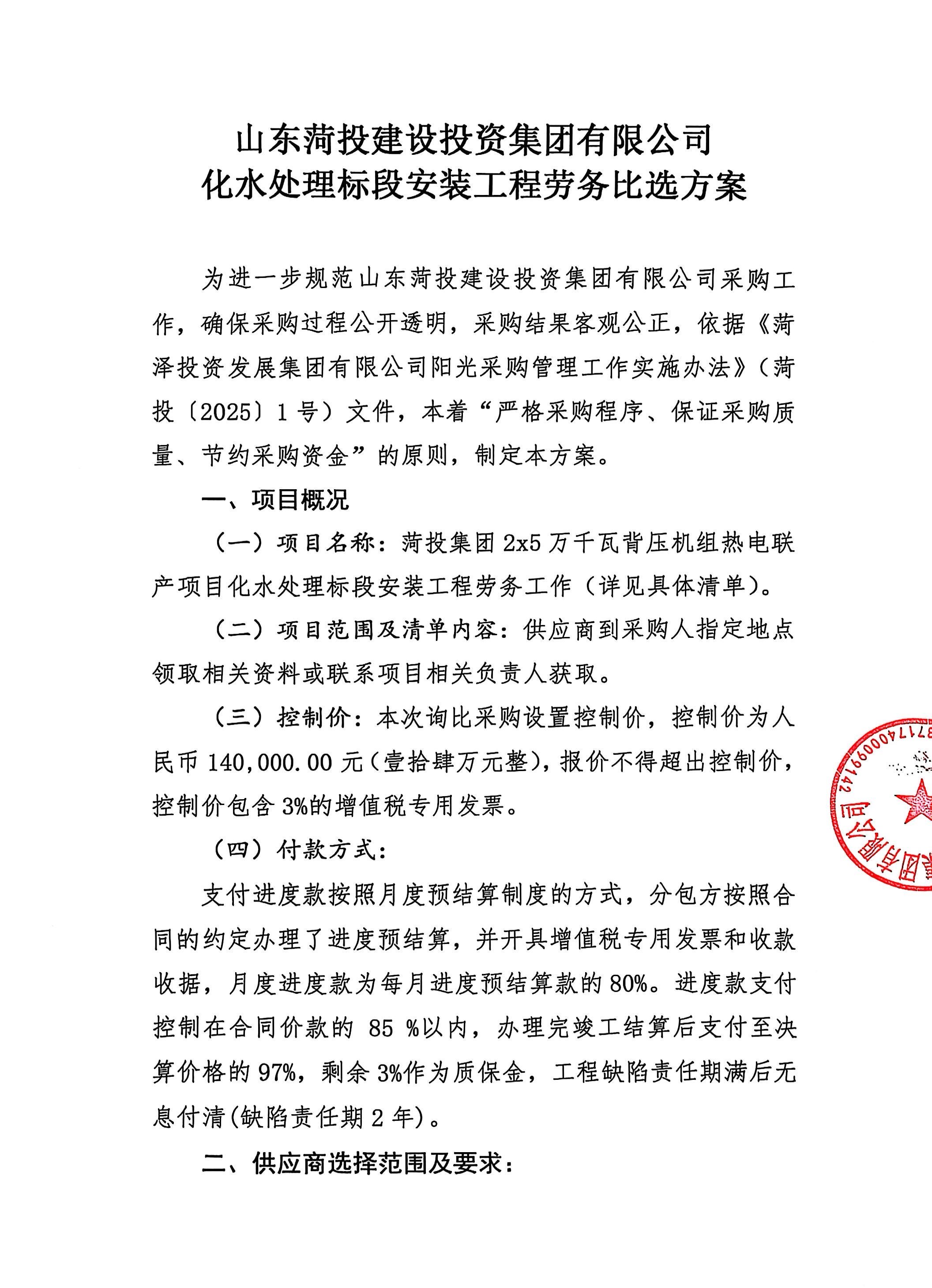 山东菏投建设投资集团有限公司化水处理标段安装工程劳务比选方案