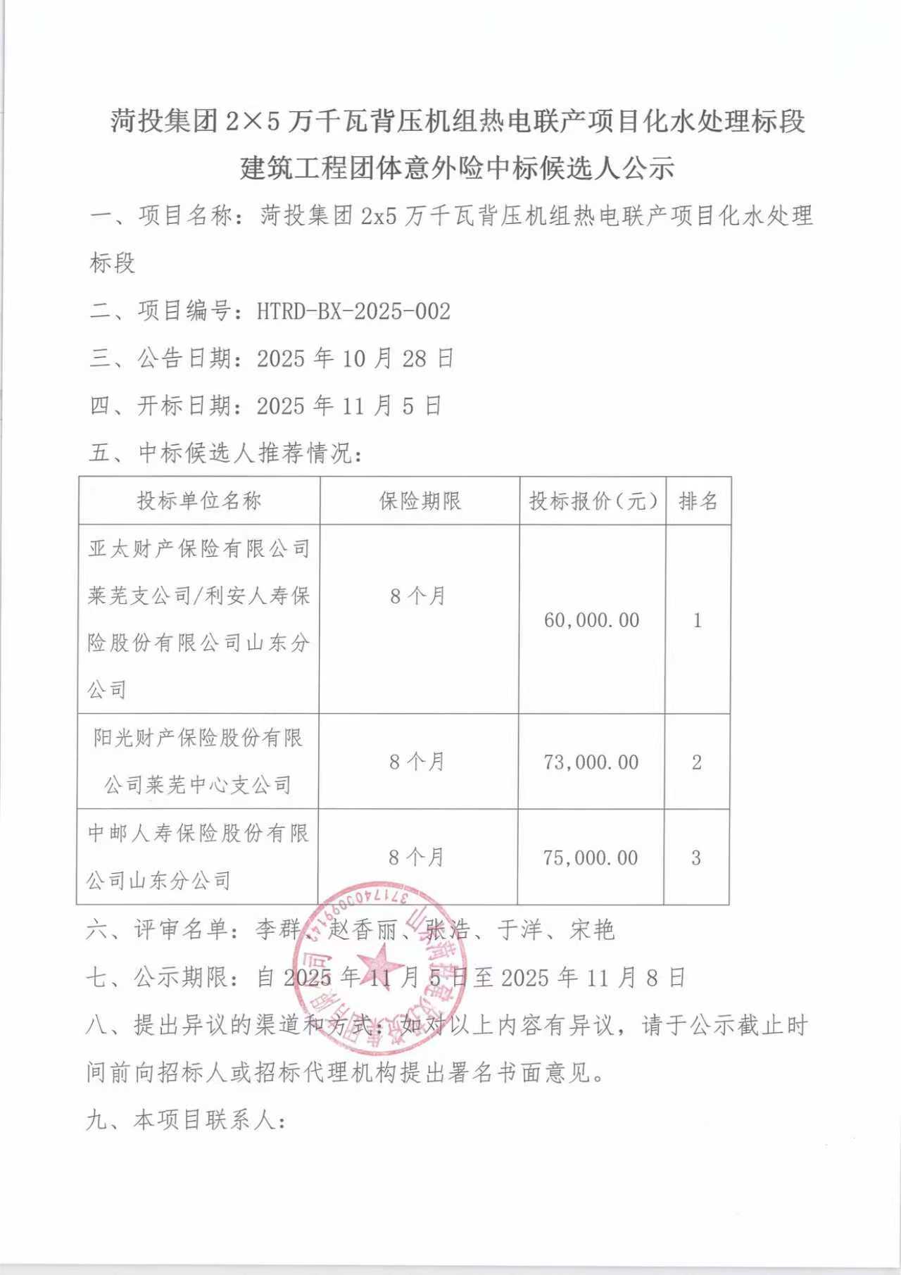 菏投集团2X5万千瓦背压机组热电联产项目化水处理标段 建筑工程团体意外险中标候选人公示