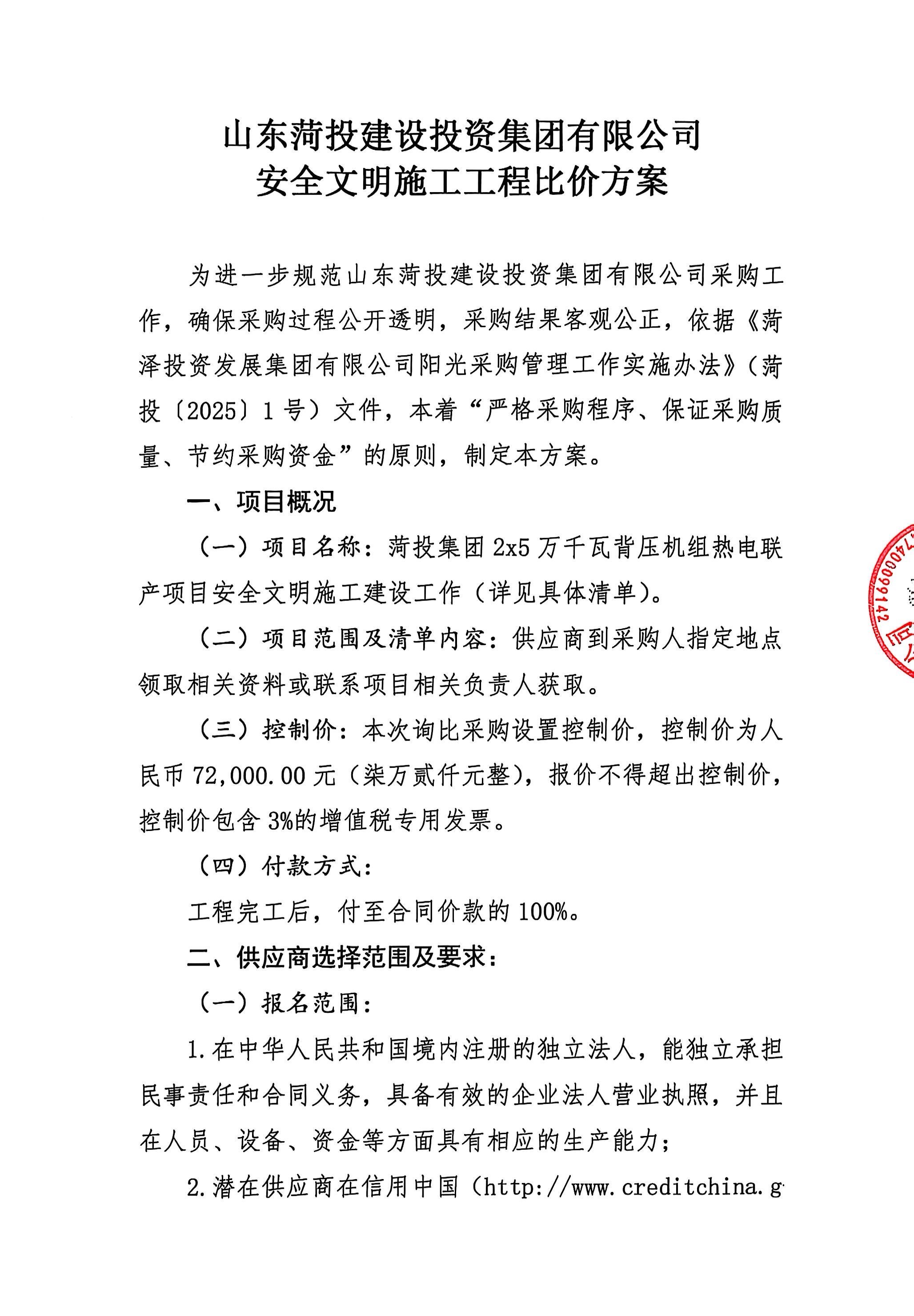 山东菏投建设投资集团有限公司安全文明施工工程比价方案