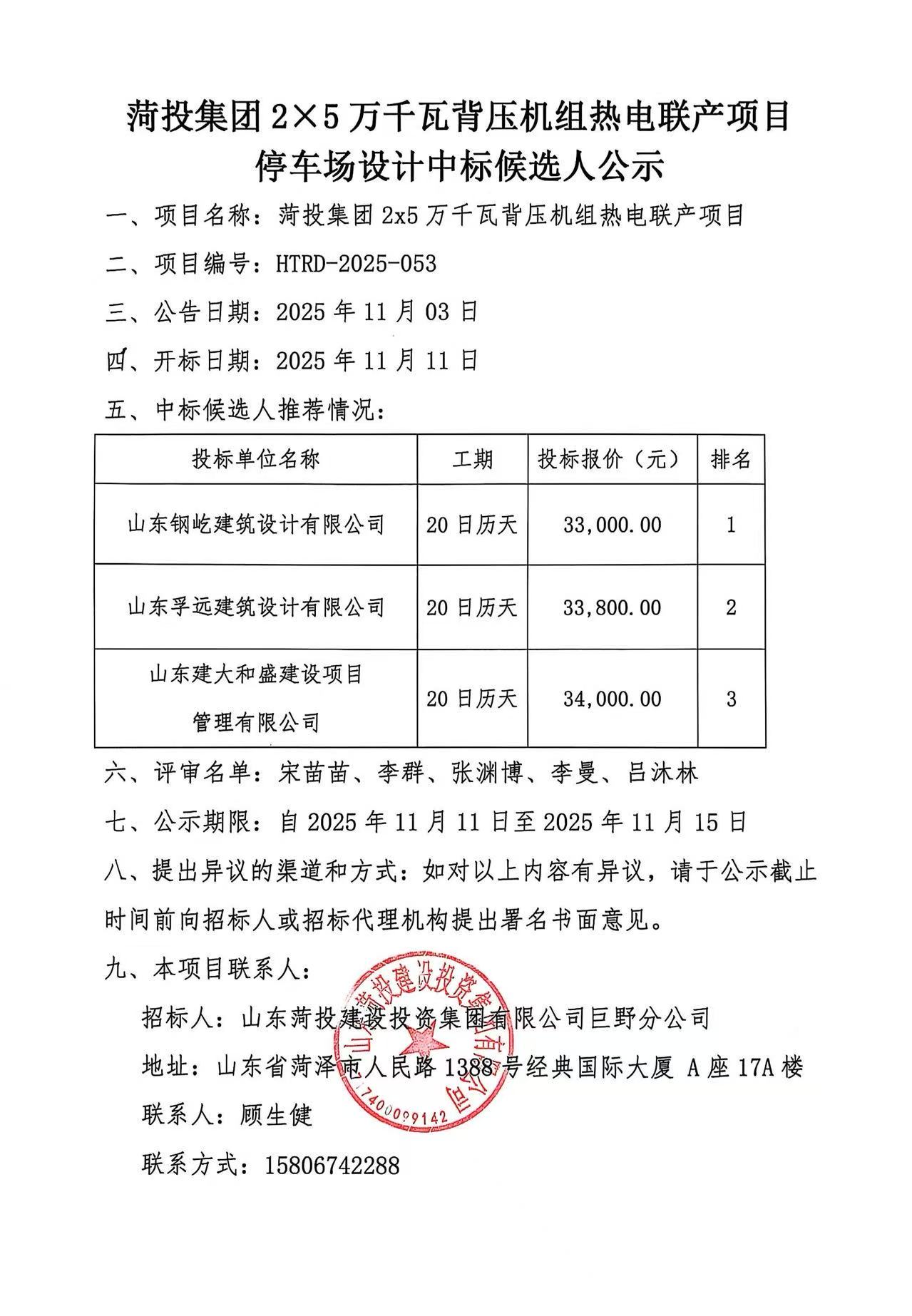菏投集团2X5万千瓦背压机组热电联产项目 停车场设计中标候选人公示