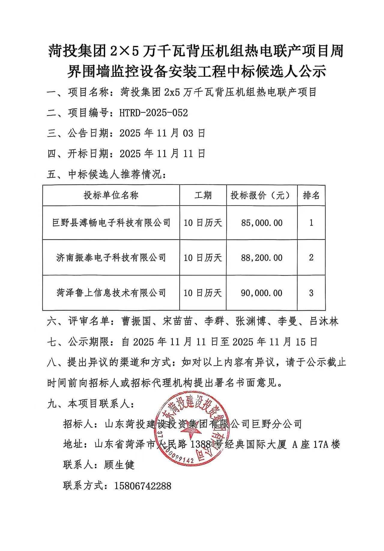 菏投集团2X5万千瓦背压机组热电联产项目周 界围墙监控设备安装工程中标候选人公示