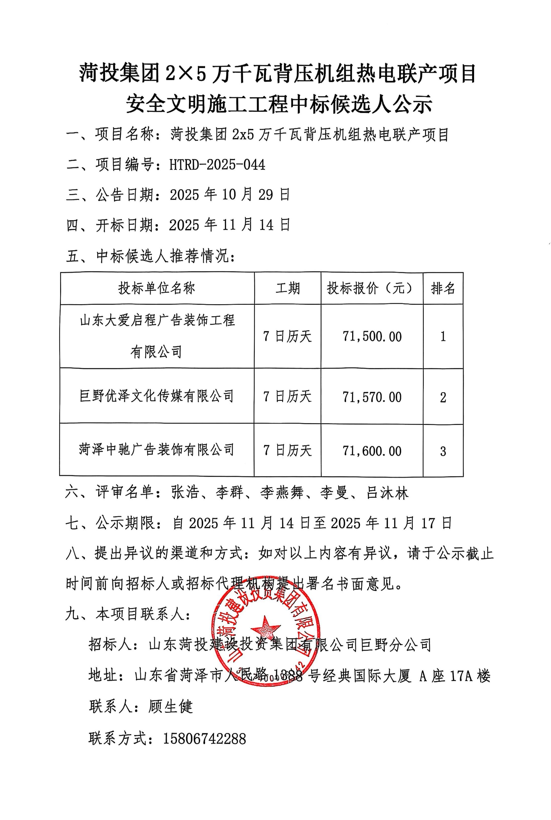 菏投集团2X5万千瓦背压机组热电联产项目 安全文明施工工程中标候选人公示