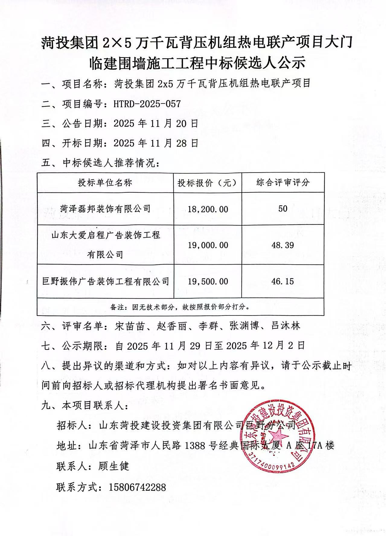 菏投集团2×5万千瓦背压机组热电联产项目大门临建围墙施工工程中标候选人公示