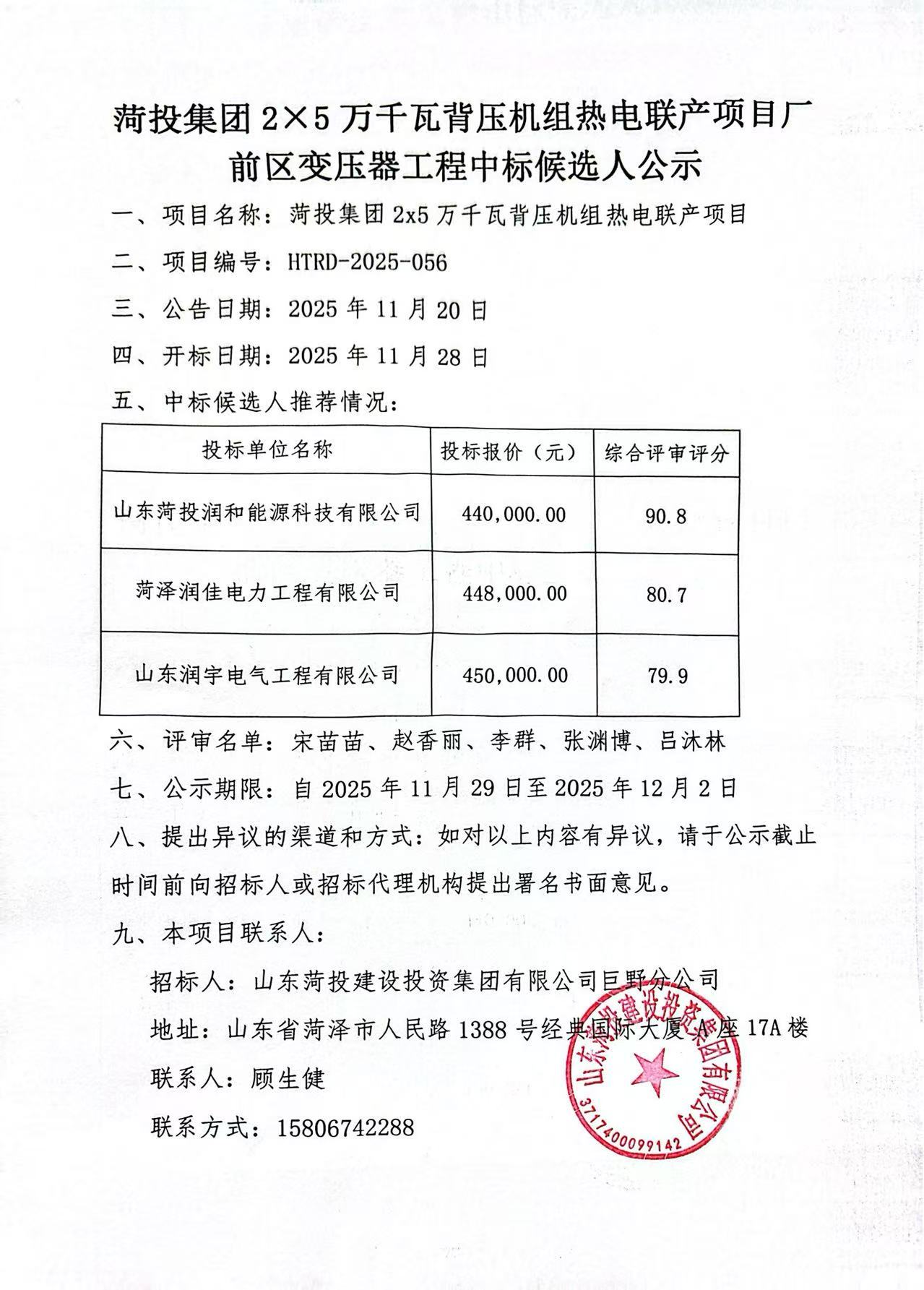 菏投集团2×5万千瓦背压机组热电联产项目厂前区变压器工程中标候选人公示