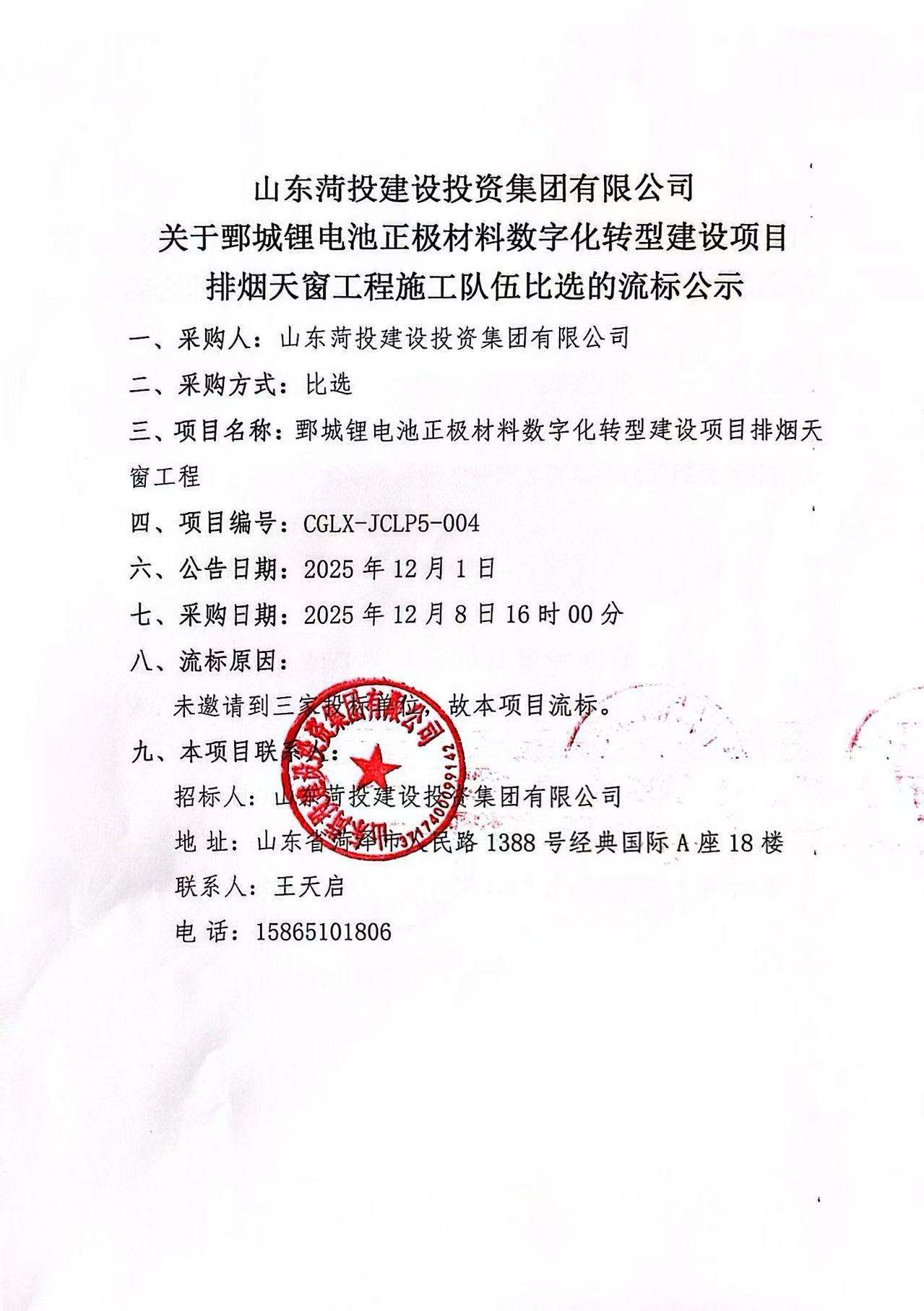 山东菏投建设投资集团有限公司关于鄄城锂电池正极材料数字化转型建设项目排烟天窗工程施工队伍比选的流标公示