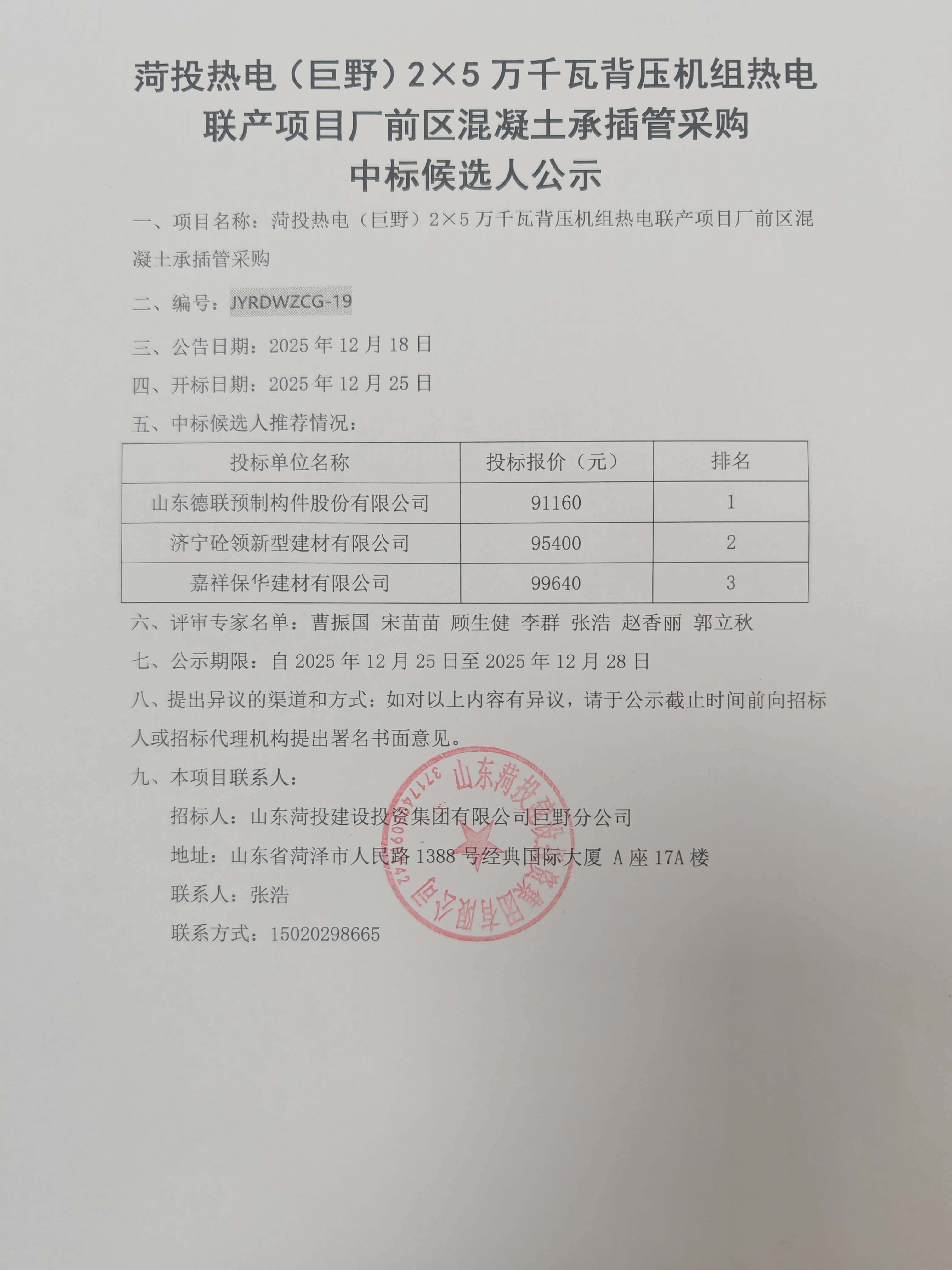 菏投热电(巨野)2X5万千瓦背压机组热电联产项目厂前区混凝土承插管采购中标候选人公示