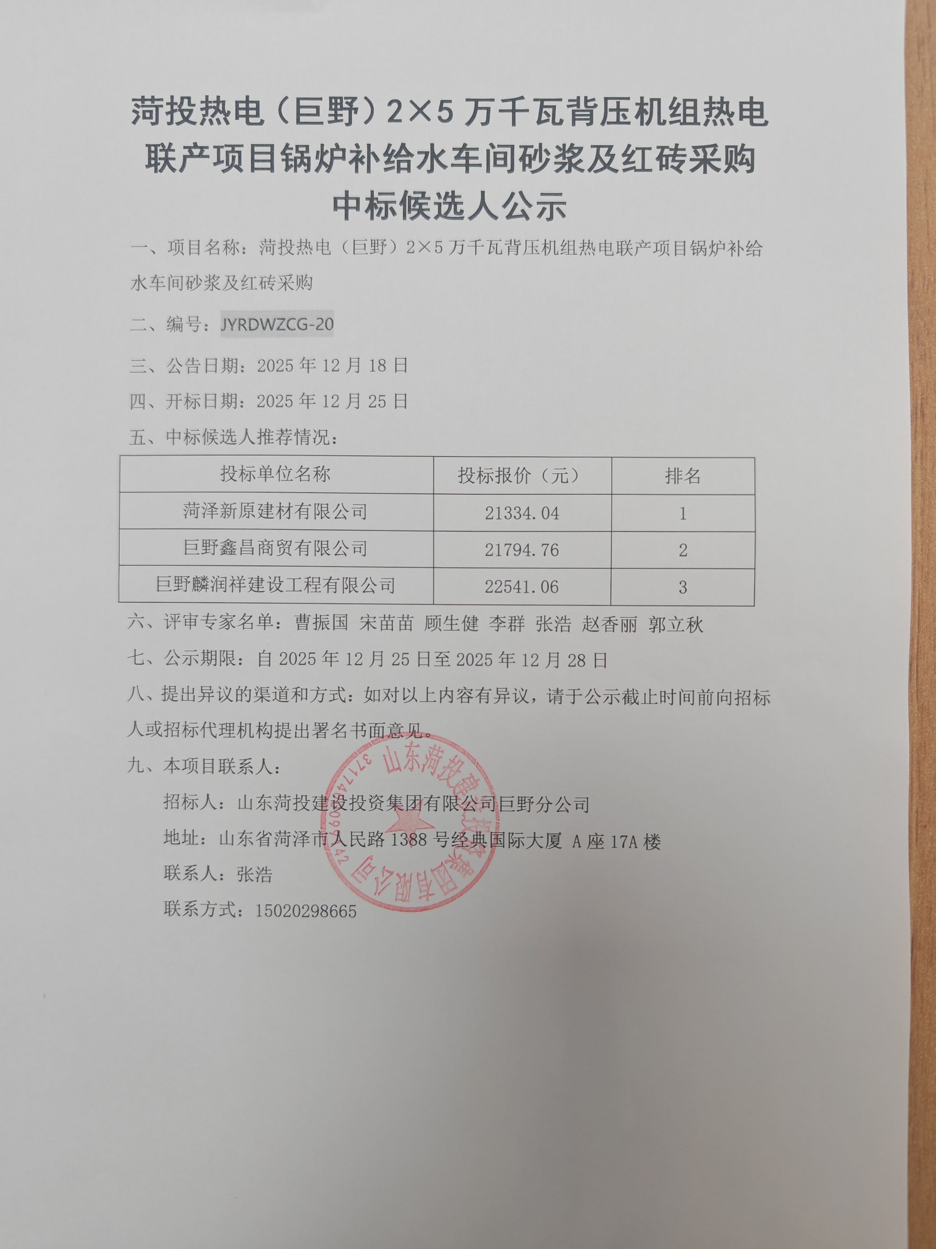 菏投热电(巨野)2X5万千瓦背压机组热电联产项目锅炉补给水车间砂浆及红砖采购中标候选人公示