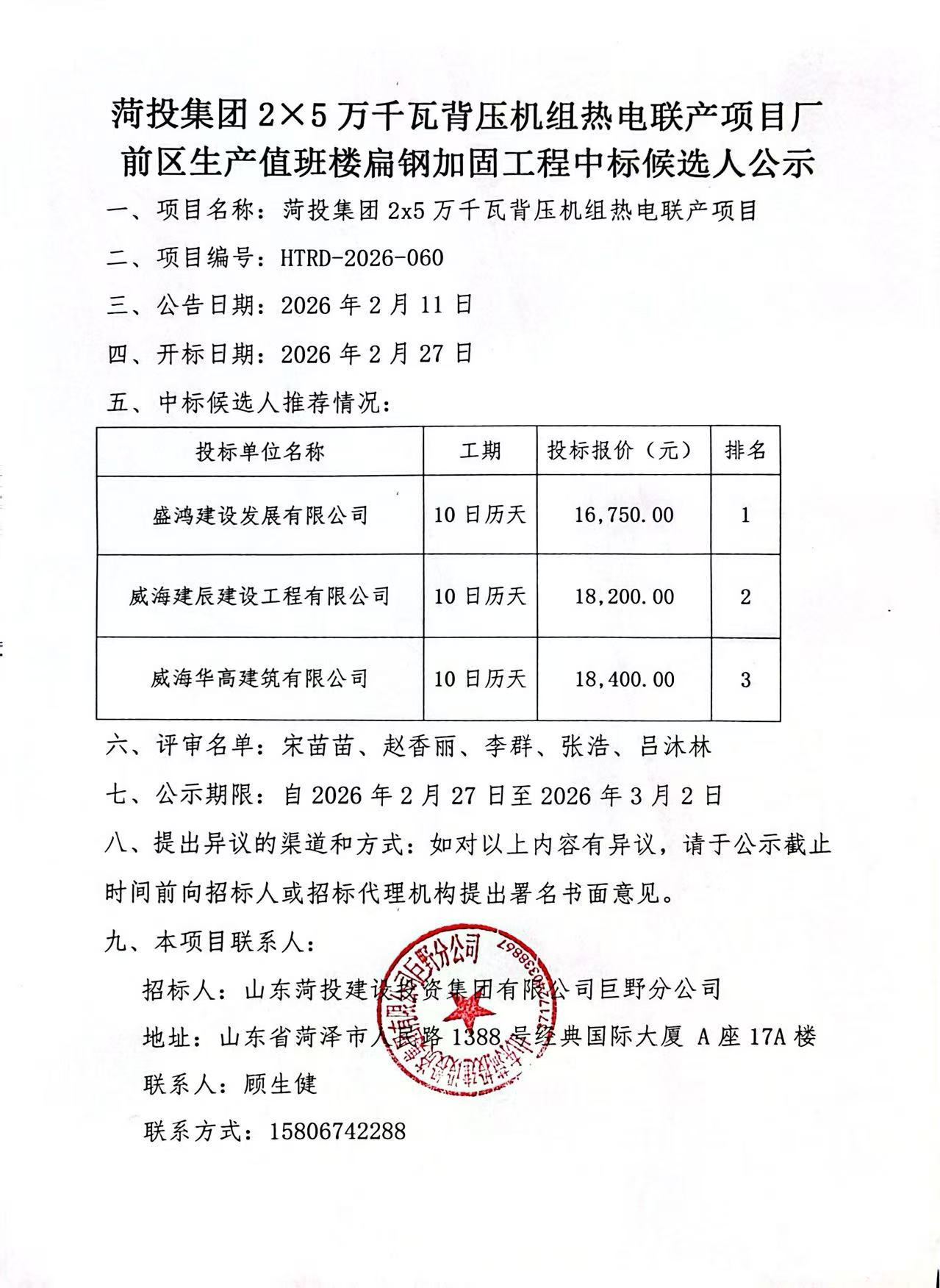 菏投集团2X5万千瓦背压机组热电联产项目厂前区生产值班楼扁钢加固工程中标候选人公示