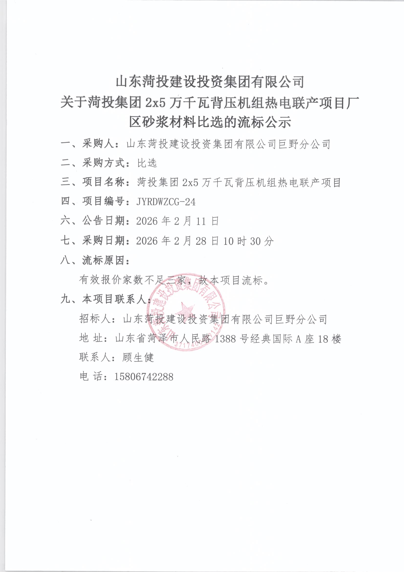 山东菏投建设投资集团有限公司关于菏投集团2x5万千瓦背压机组热电联产项目厂区砂浆材料比选的流标公示