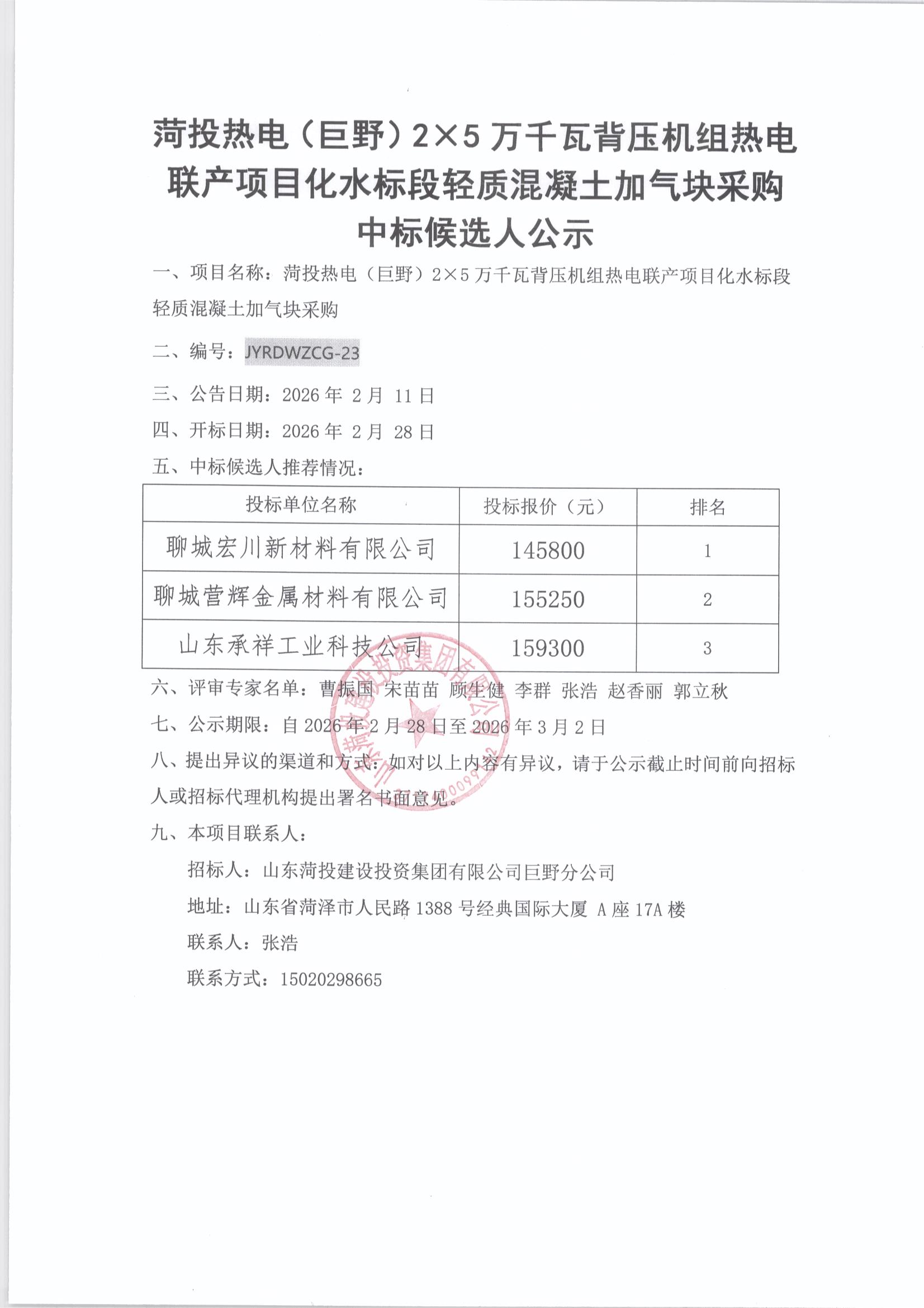 菏投热电(巨野)2X5万千瓦背压机组热电联产项目化水标段轻质混凝土加气块采购中标候选人公示