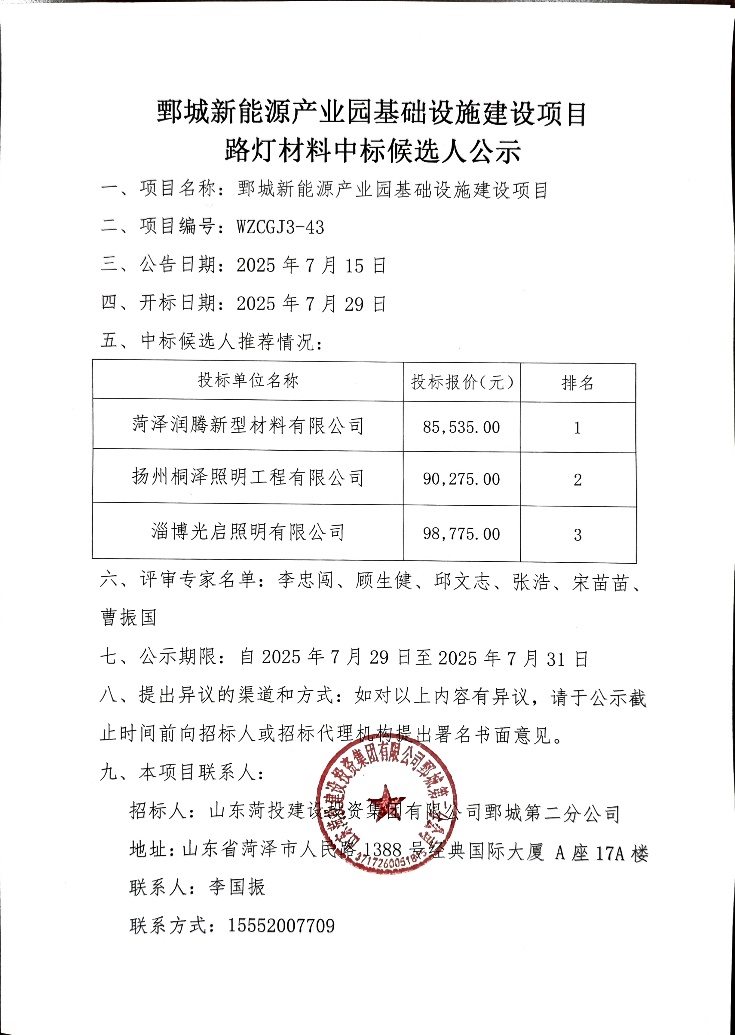鄄城新能源产业园基础设施建设项目路灯材料中标候选人公示