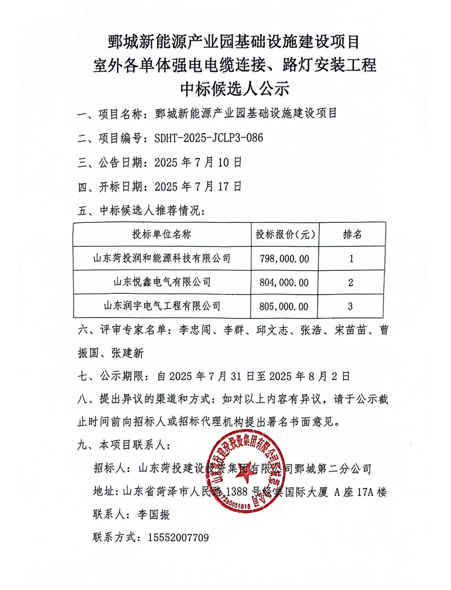 鄄城新能源产业园基础设施建设项目室外各单体强电电缆连接、路灯安装工程中标候选人公示