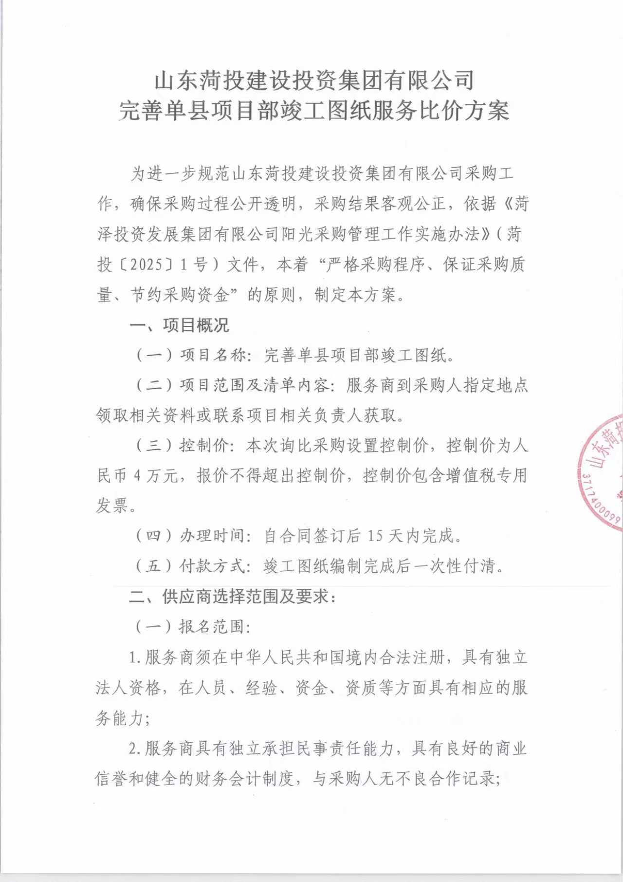 山东菏投建设投资集团有限公司 完善单县项目部竣工图纸服务比价方案