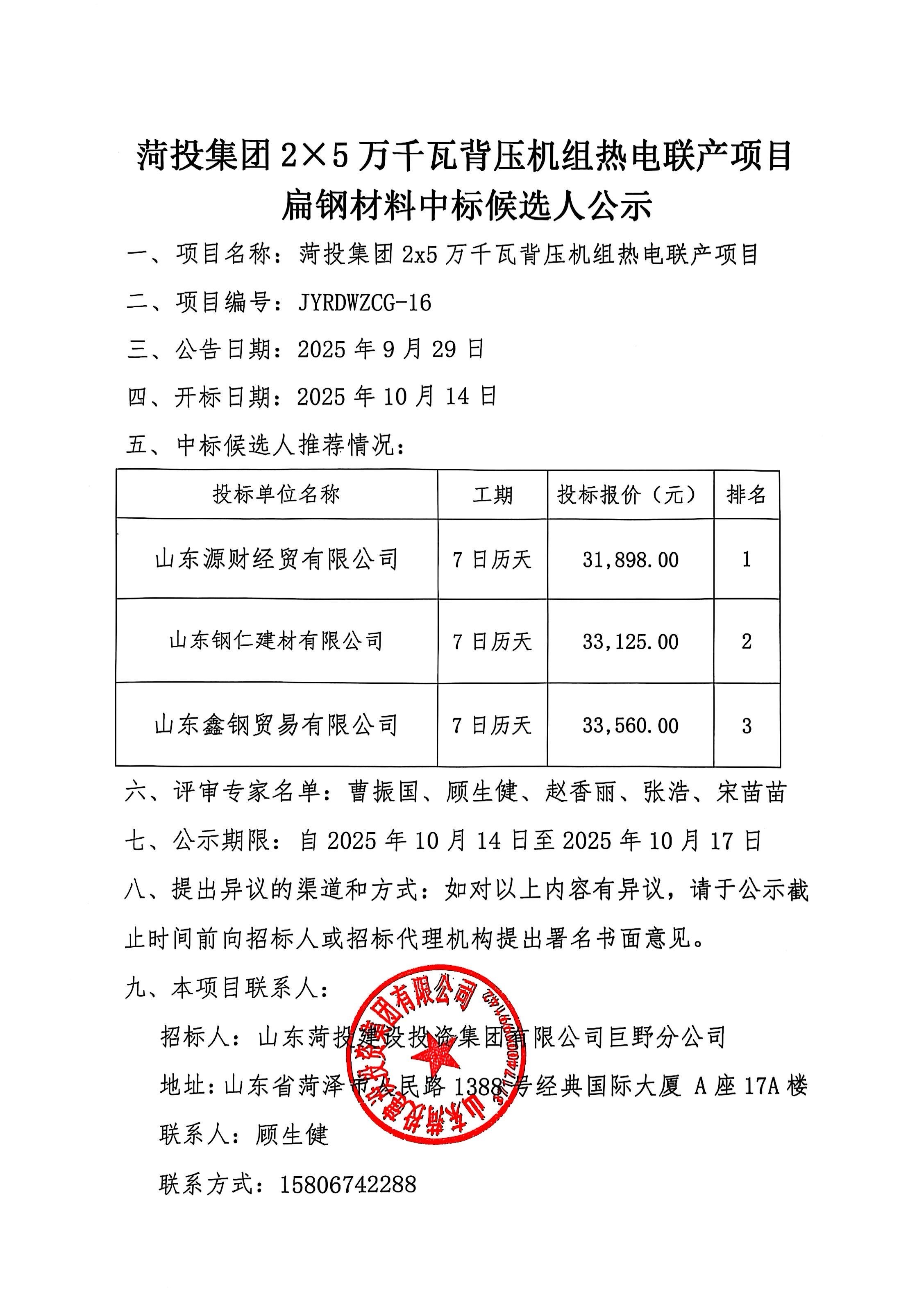 菏投集团2X5万千瓦背压机组热电联产项目扁钢材料中标候选人公示