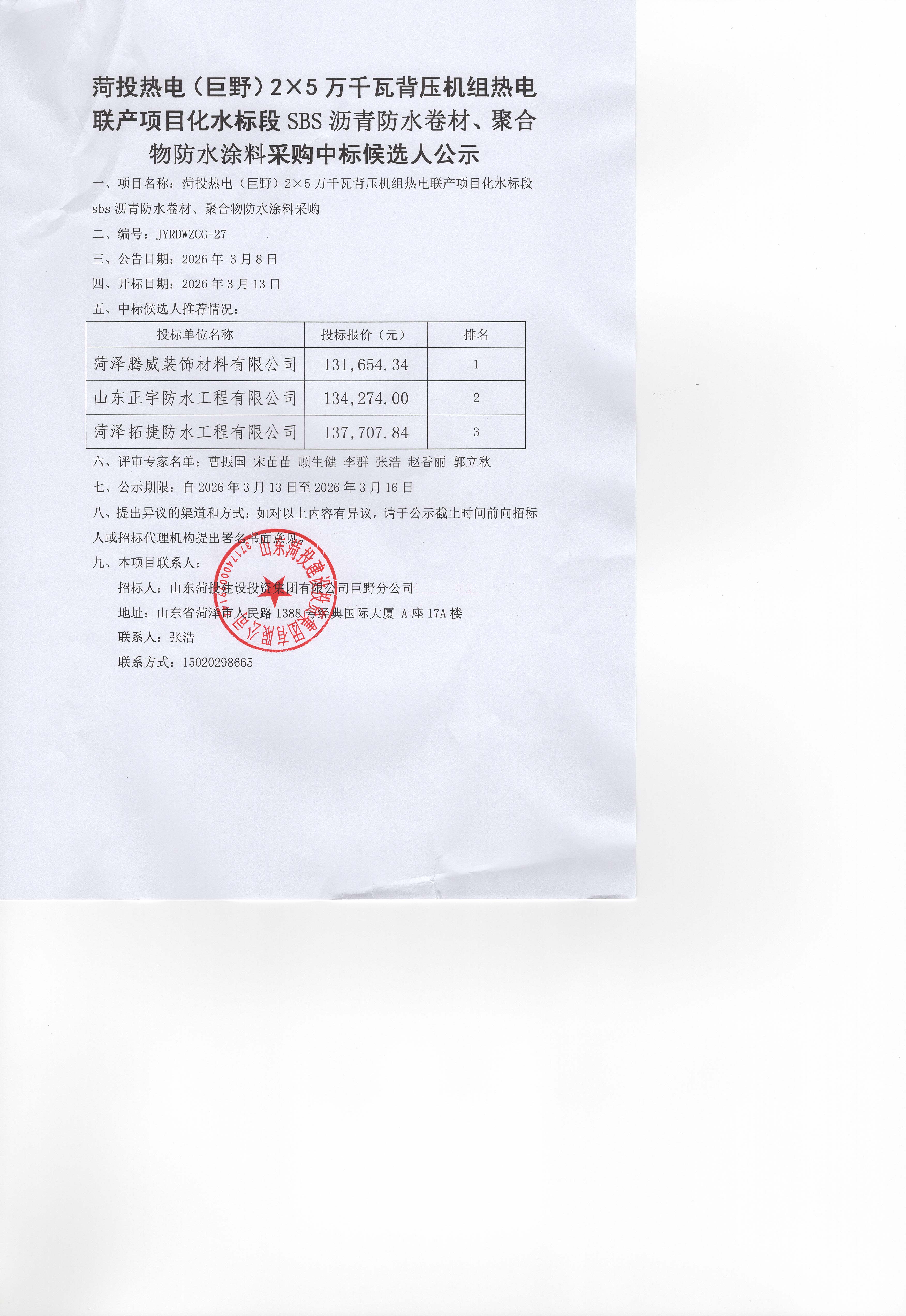 菏投热电(巨野)2X5万千瓦背压机组热电联产项目化水标段SBS沥青防水卷材、聚合物防水涂料采购中标候选人公示
