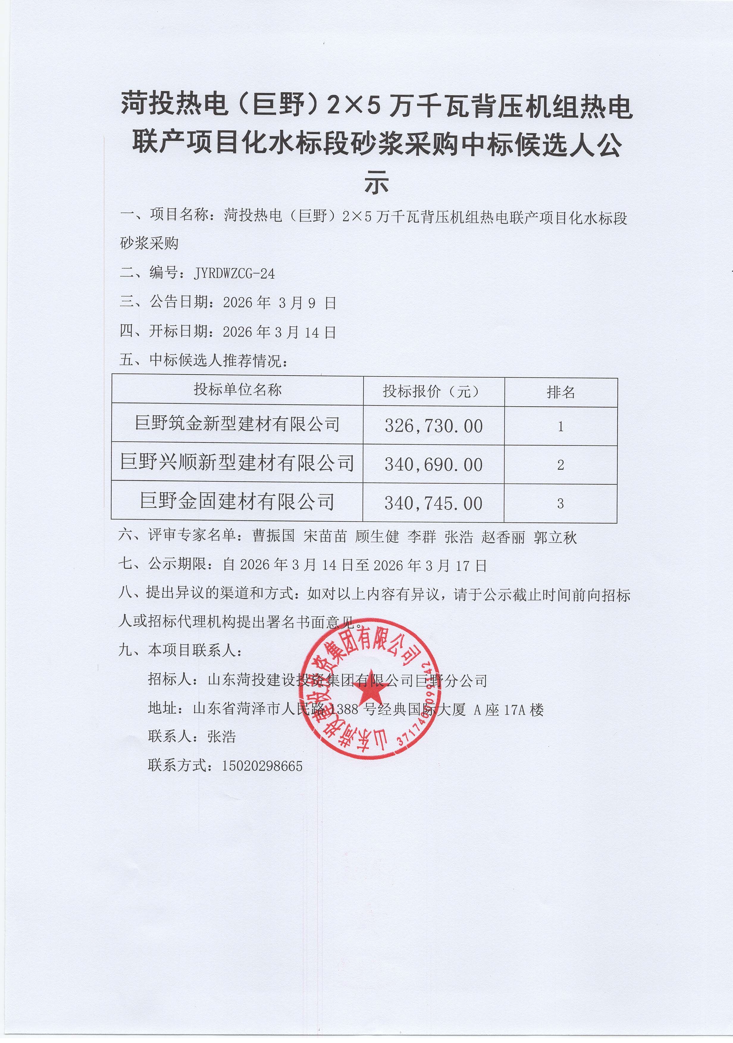 菏投热电(巨野)2X5万千瓦背压机组热电联产项目化水标段砂浆采购中标候选人公 示