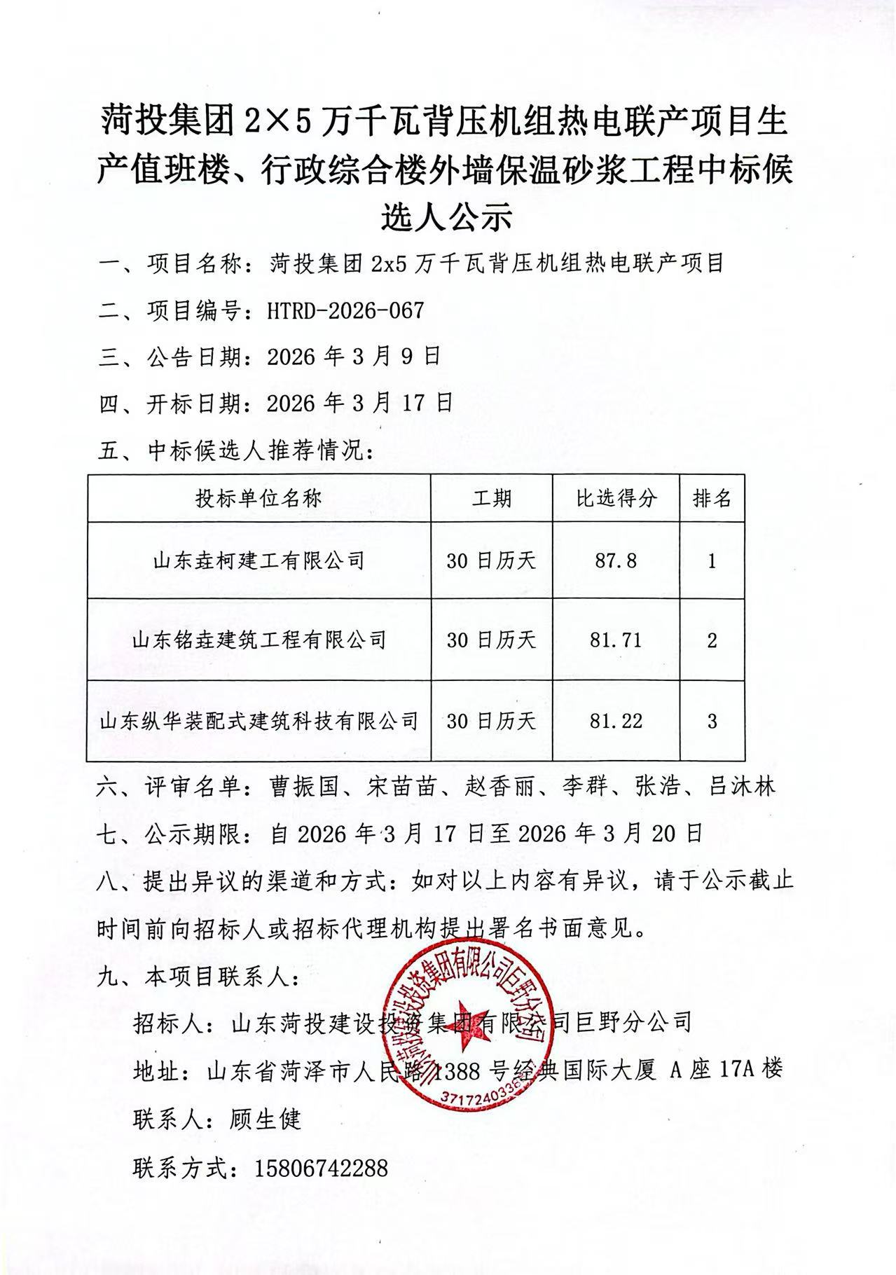 菏投集团2X5万千瓦背压机组热电联产项目生产值班楼、行政综合楼外墙保温砂浆工程中标候选人公示