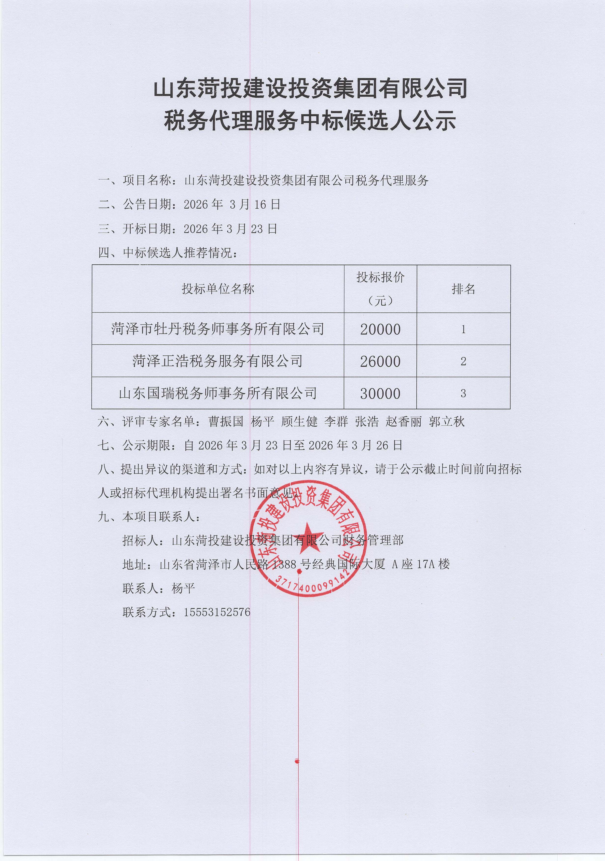山东菏投建设投资集团有限公司税务代理服务中标候选人公示