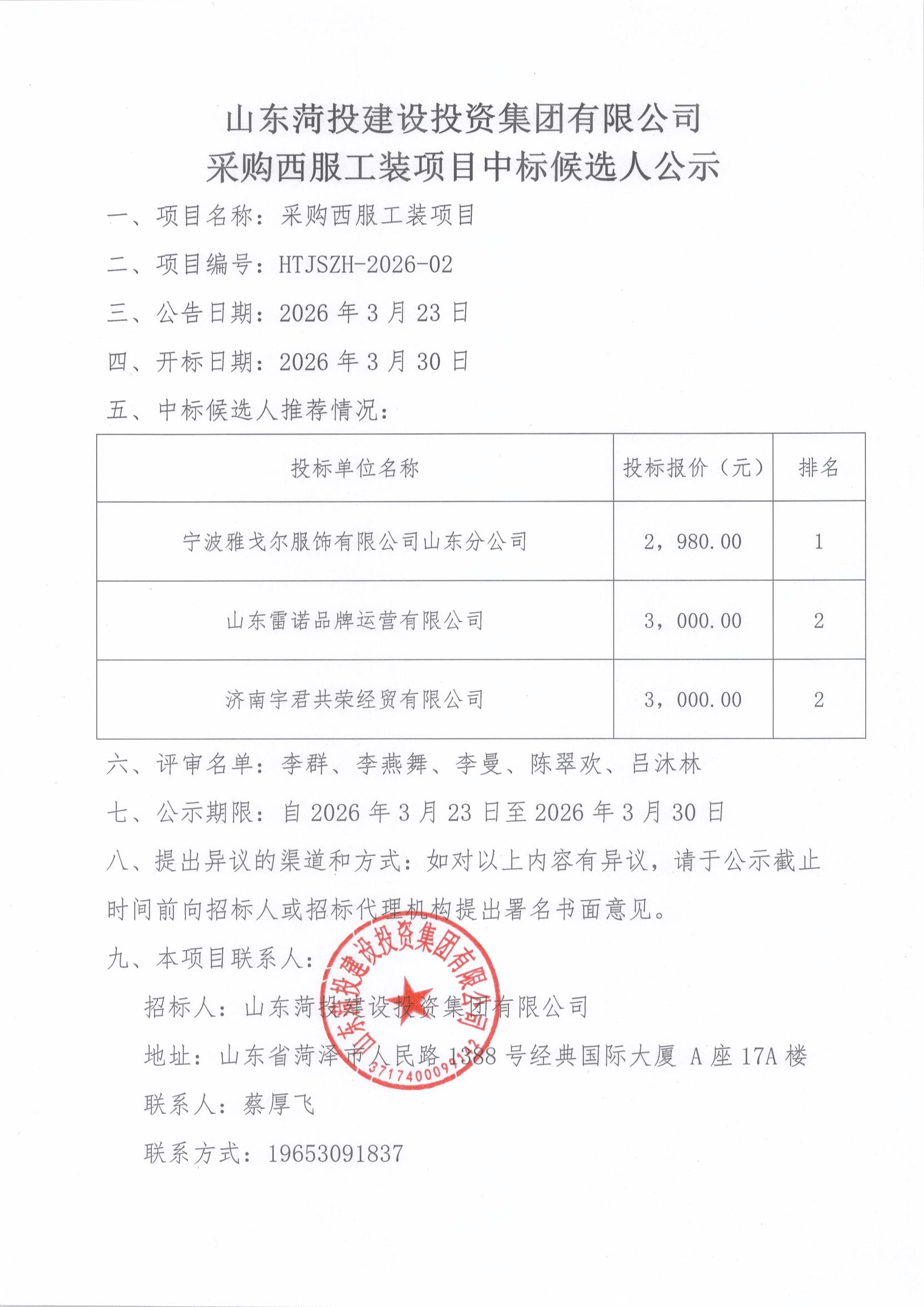 山东菏投建设投资集团有限公司采购西服工装项目中标候选人公示